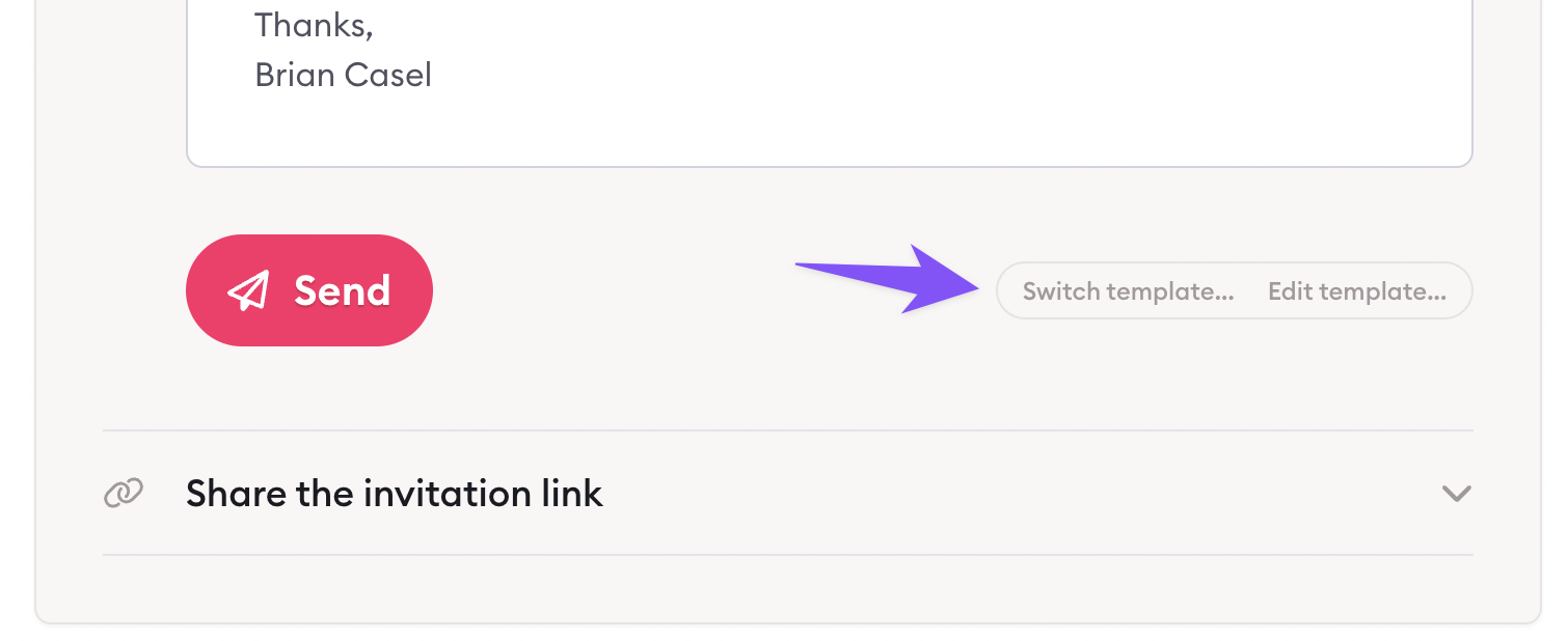 To switch the invitation template, click the link at the bottom-right corner, below the email form in your invitation:
